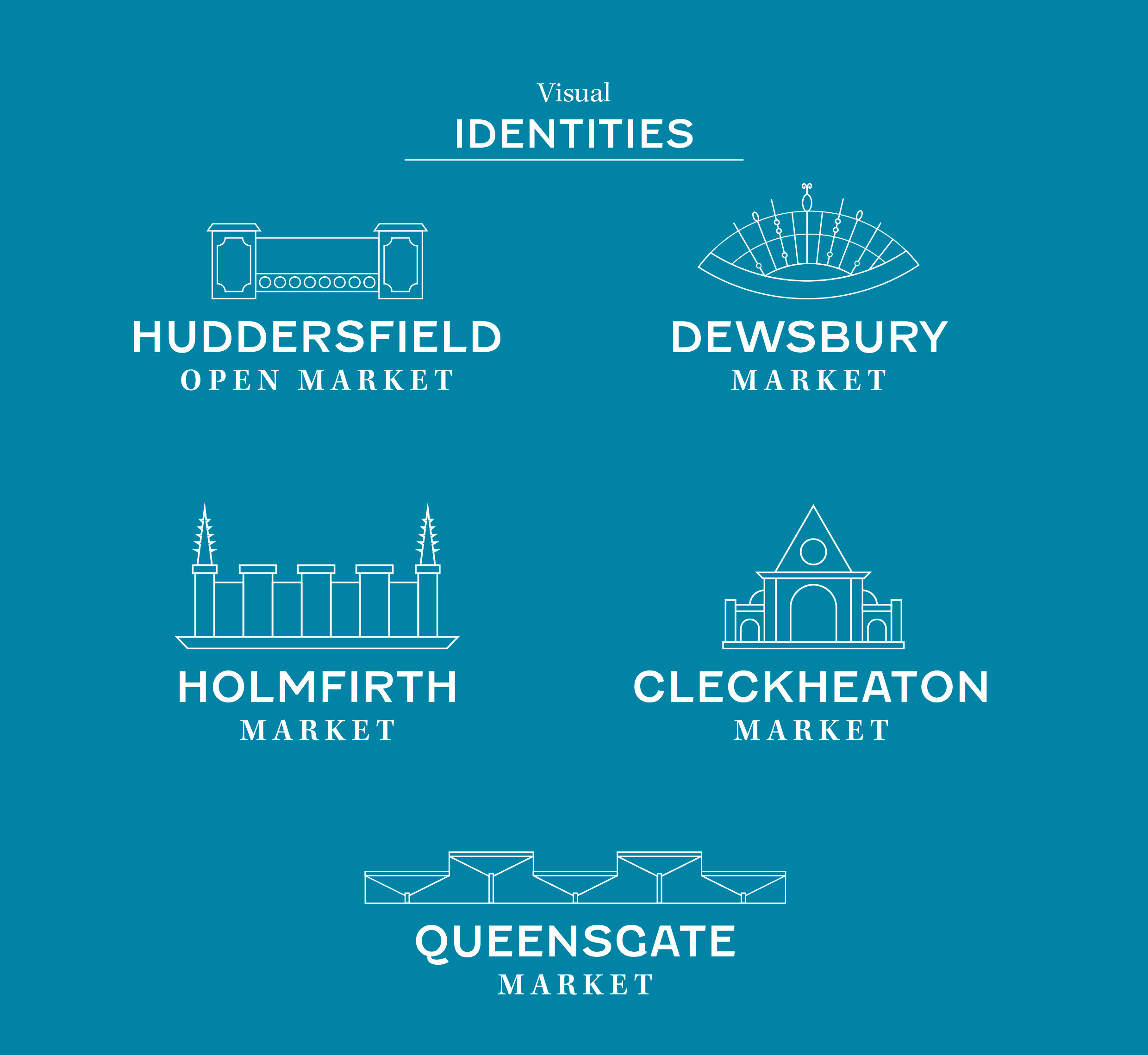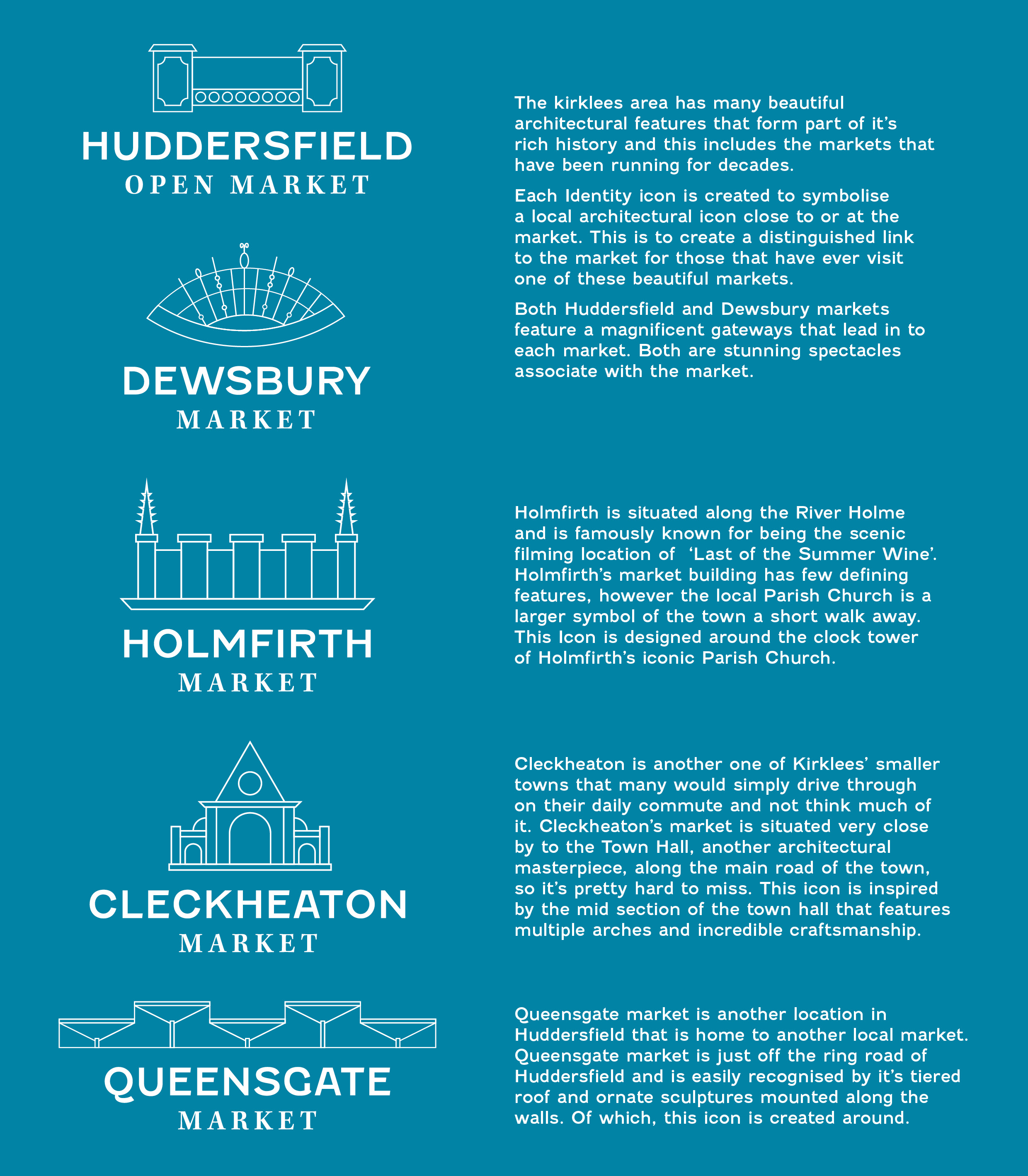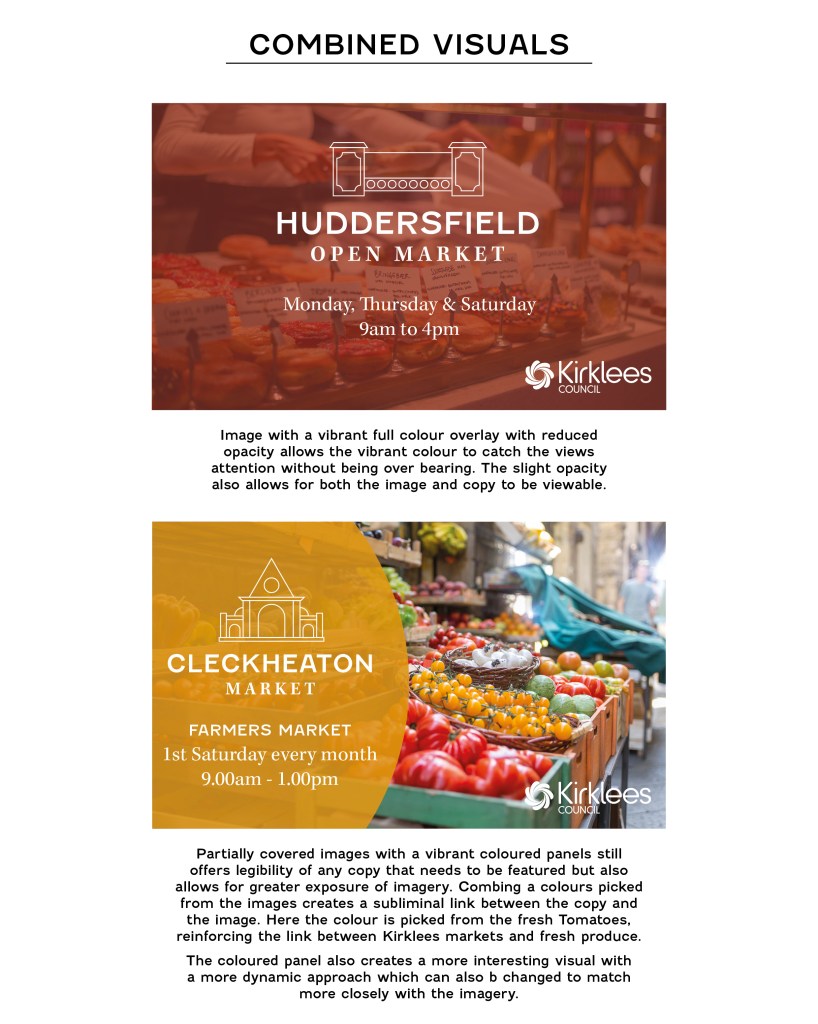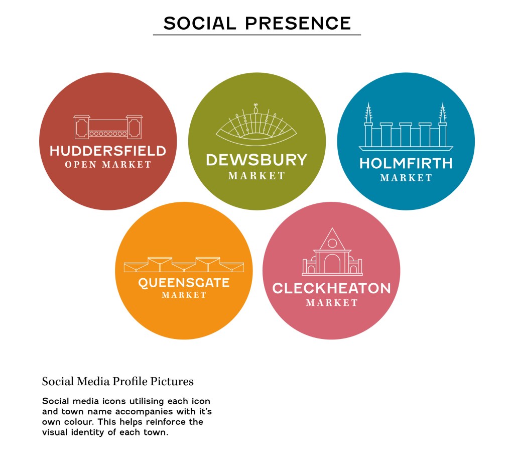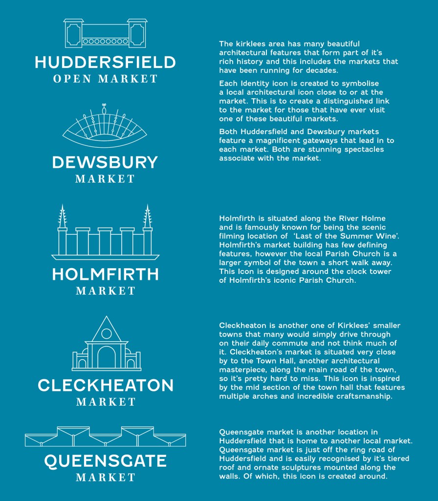 Going with a clean illustrative style to make the visual identities legible from a distance and have contemporary up to date style to bring the market into the present day. The font pairing chosen was to reflect the existing signage and allow for hints of the market heritage but with a more modern look. The colour schemes were to be taken from imagery from the actual markets to tie all the visuals together but predominantly adhering to a more inviting and friendly colour palette.
